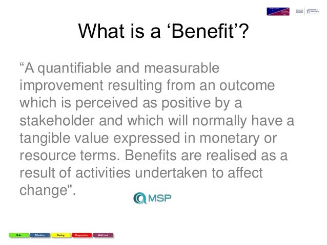 What is the benefit. Something that promotes or enhances well-being. A helpful or good effect or something intended to help. Is at the heart of the word benefit which derives from the Latin benefactum good deed.