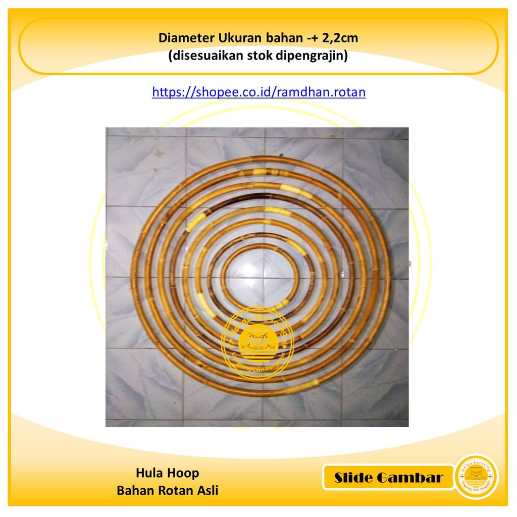 -Diameter Hula Hoop 90 cm -Ketebalan Rotan 23cm -Berat barang 400gram -Berat kirim 2kg Pengiriman dikenakan dimensi. Read more about hula hoop size here. Many hoopers in the USA also buy their pipe from a company called LOWES.